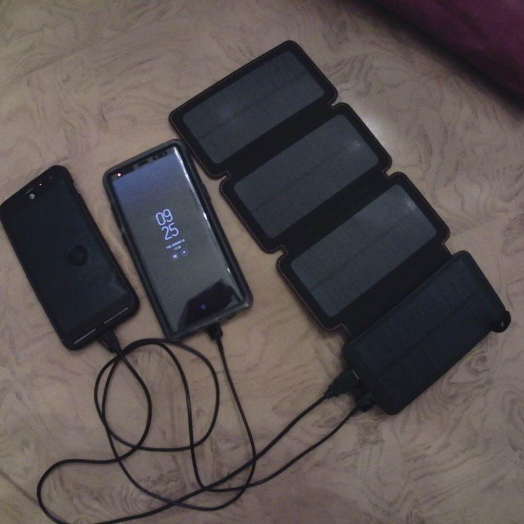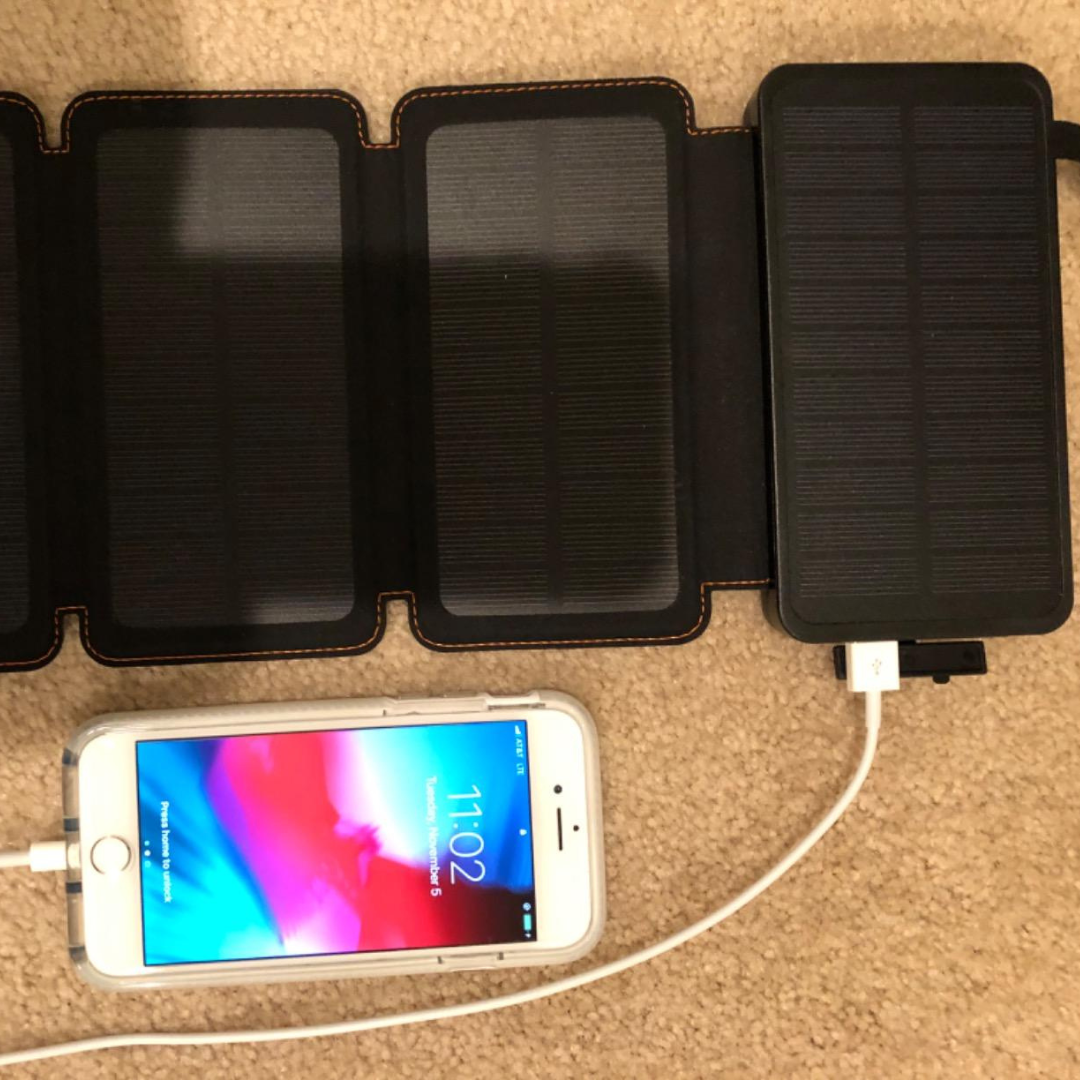Solar input is modest (≈1 A under good sunlight), so it’s best used as a trickle or emergency backup. USB-C 20 W input is much faster for full recharges.