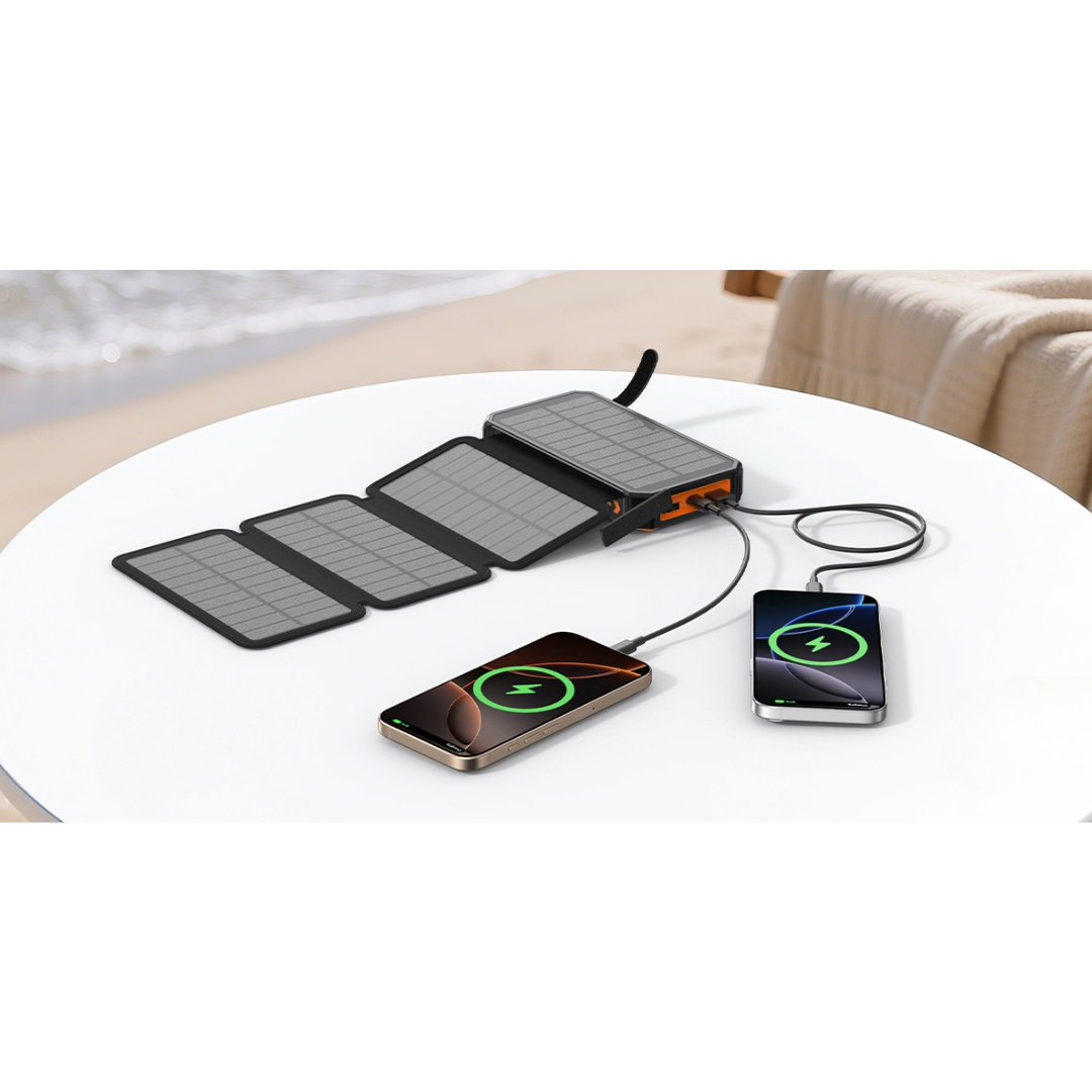 Stay powered for days with the ultra-high 48,000mAh solar power bank. Built with a durable lithium-polymer battery, it provides safer, longer-lasting performance—offering up to 80% more charging cycles than standard batteries.